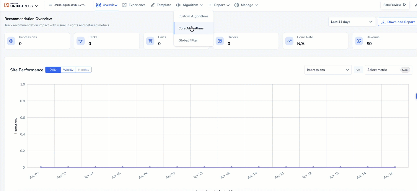 To access the core algorithms, log in to Netcore Unbxd Recommendation Console and navigate to Algorithms > Core Algorithms