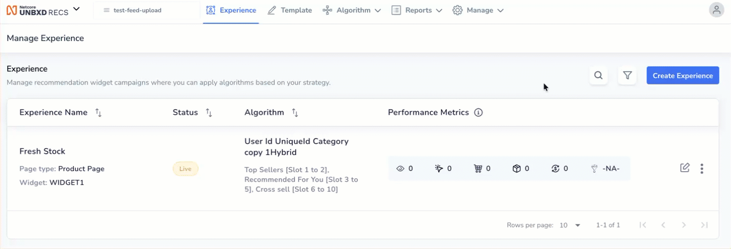 Log in to your Netcore Unbxd Recommendation panel and click Experience to manage the recommendation widgets.