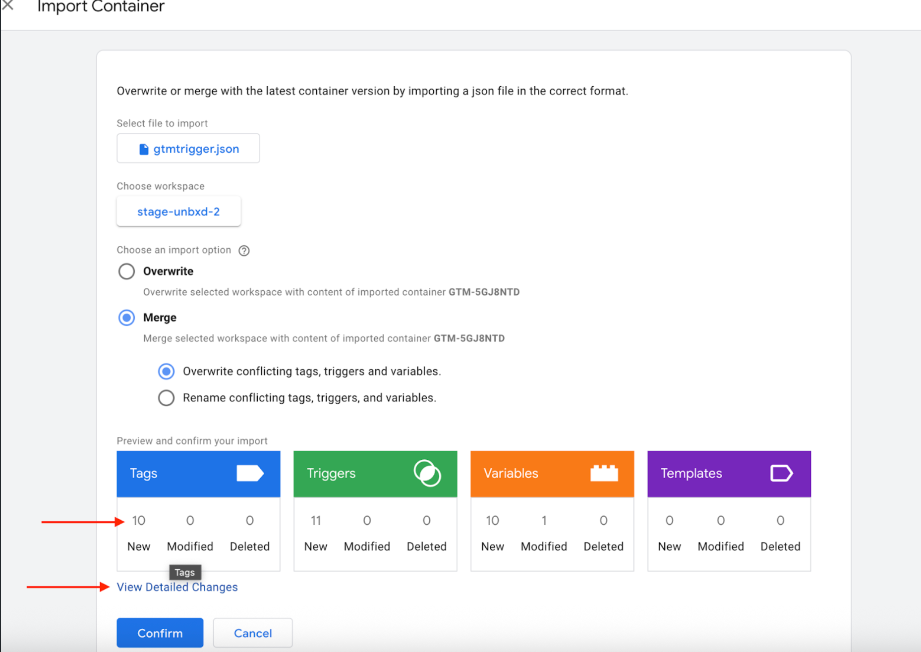 - Finally, after previewing the details click on confirm. That will bring in all these tags into the selected workspace for the container. You can validate by checking the tags, triggers and variables.