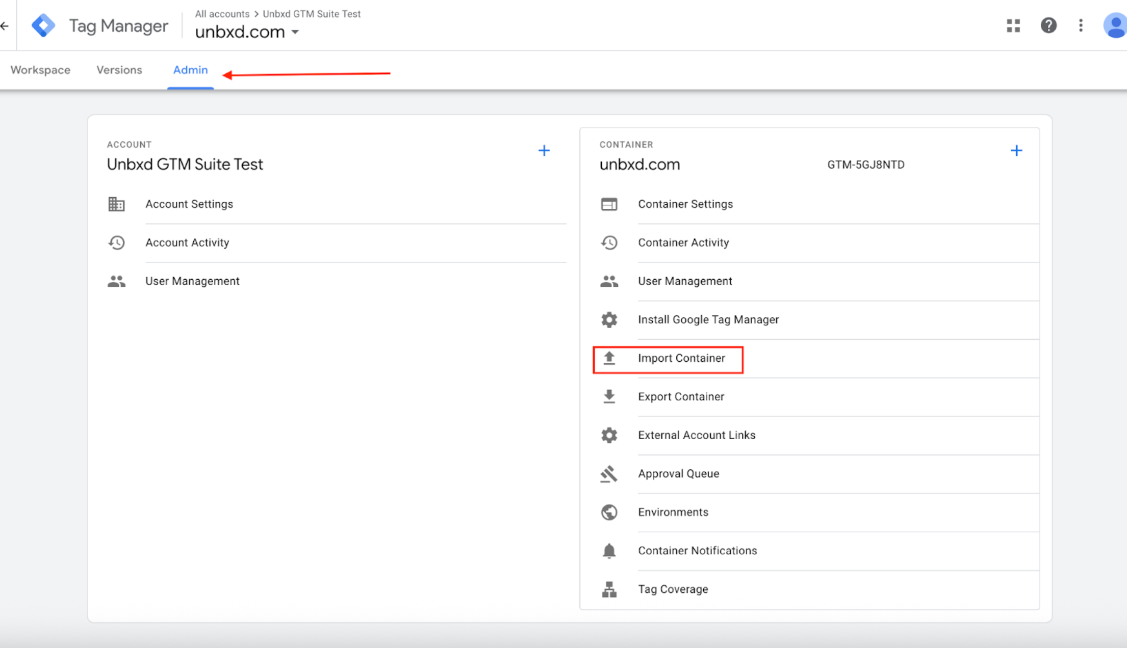- Log in to the customer GTM dashboard and in the appropriate workspace where we need to add the Unbxd-related configs for tags and triggers. Inside this page, click on the Admin tab as mentioned in the screenshot below: