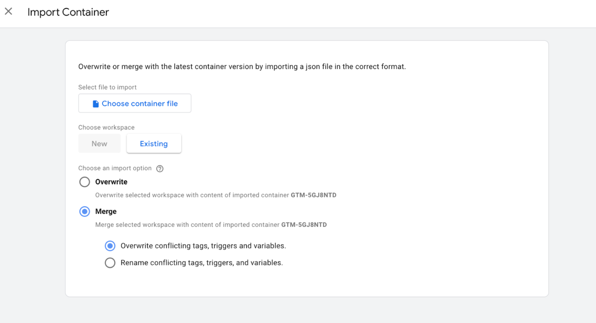 - In “Choose an import option” > select option to “Merge” > “Overwrite conflicting tags, triggers and variables”.