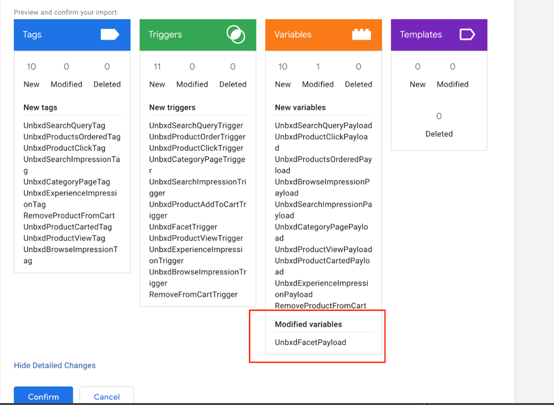 NoteOur tags, triggers and variables have Unbxd specific names and we should ideally overwrite. Please select this under merge option and not the complete overwrite option as that will delete the existing setups from client's dashboard.