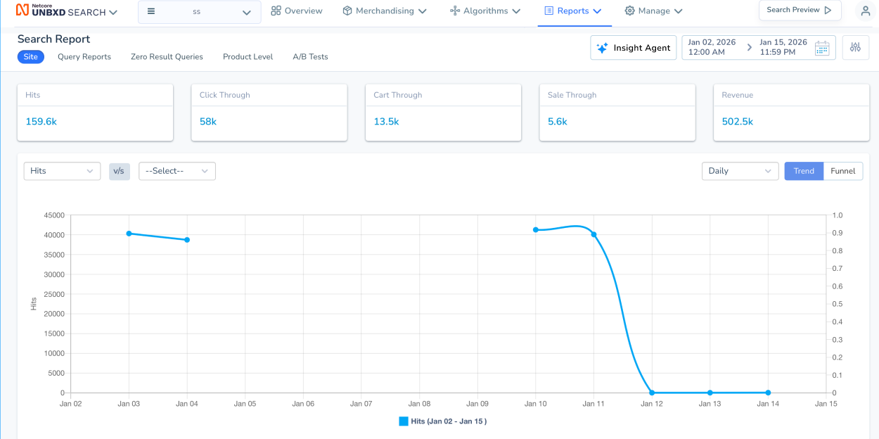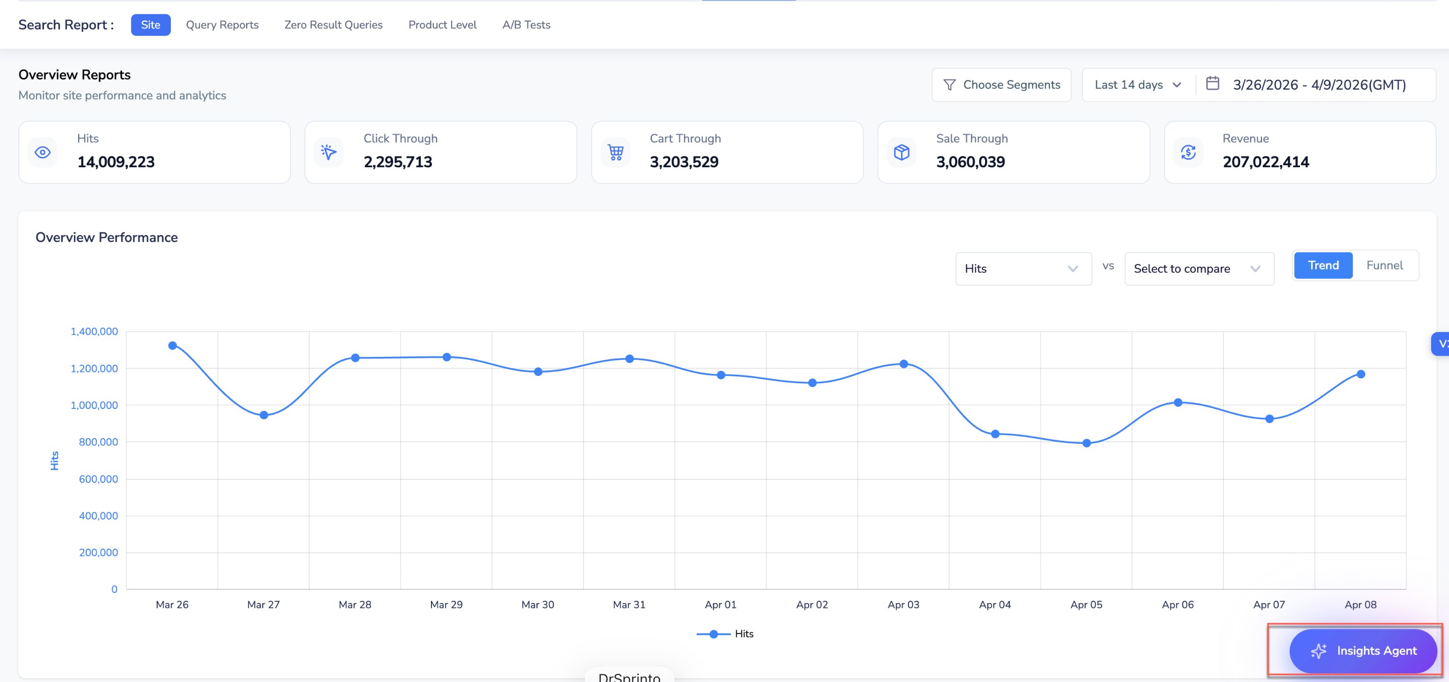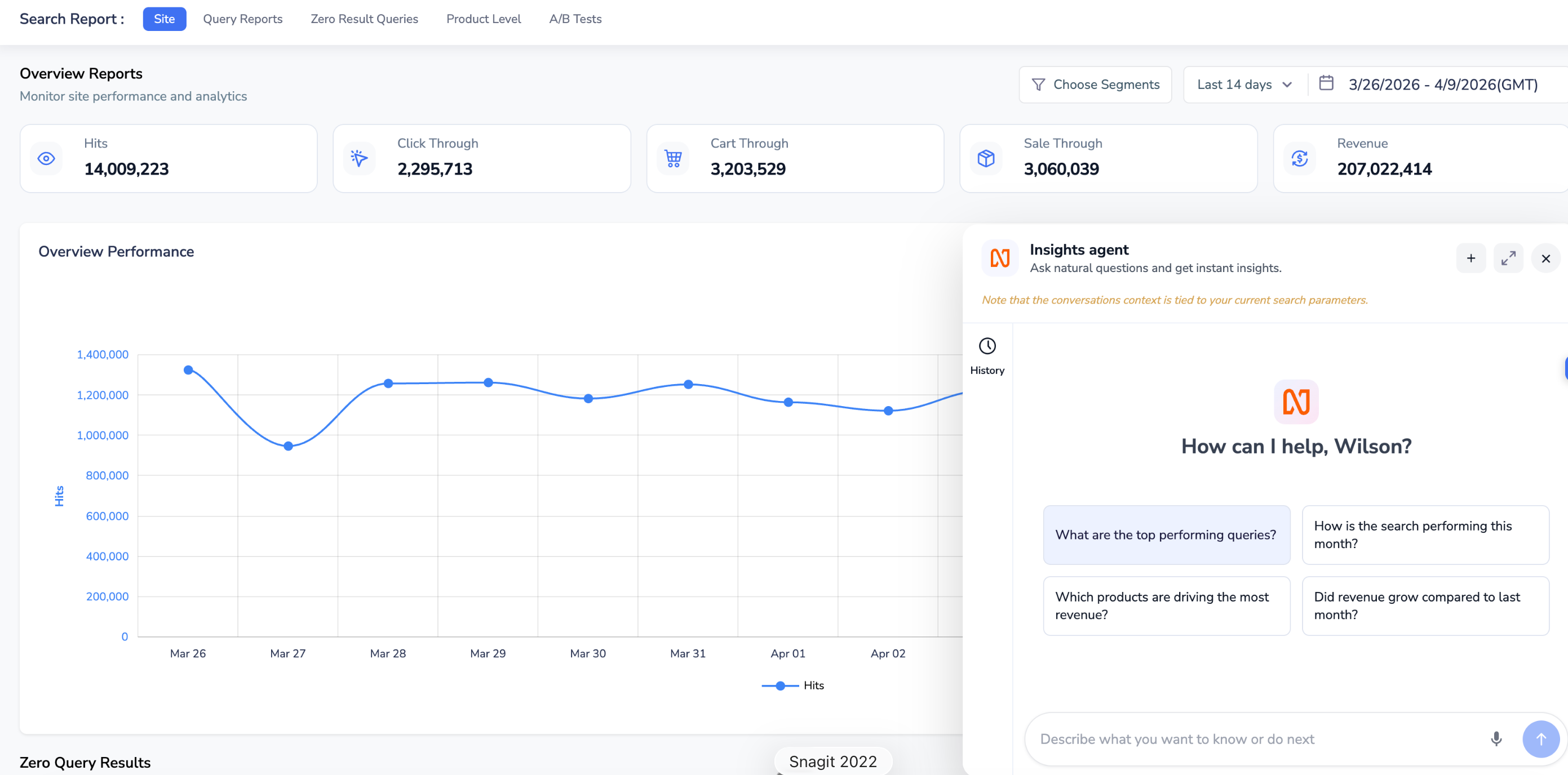 The Insights Agent is an AI-powered analytics assistant that helps you understand how your search, browse, autosuggest, and merchandising campaigns are performing, using simple natural language questions.