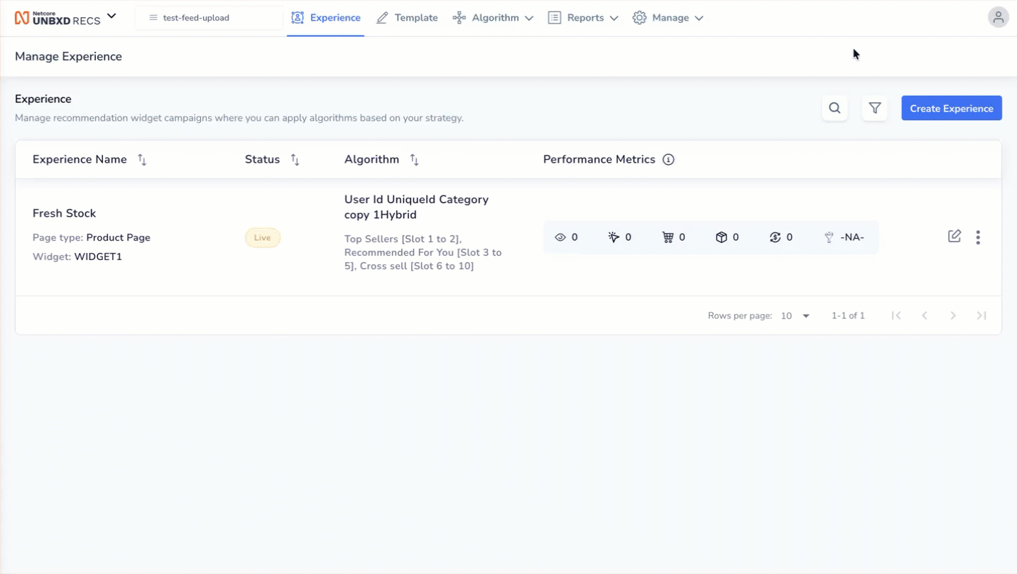 - Log in to the Unbxd Recs console. The Experience page opens by default.