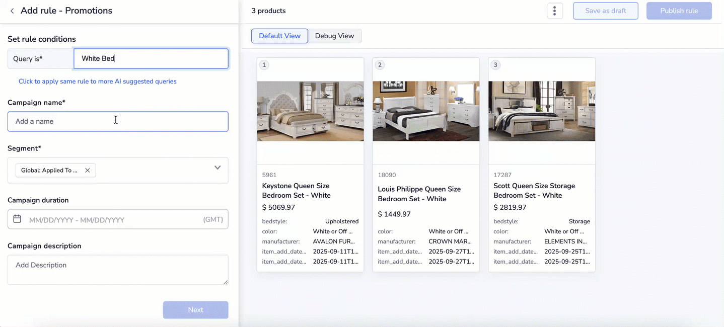 Product Freshness helps you promote newly added products in search and browse results. When a new product is added to your catalog, it often lacks clickstream data, which may push it lower in rankings. With the Freshness rule, you can temporarily boost these products to appear higher in results.