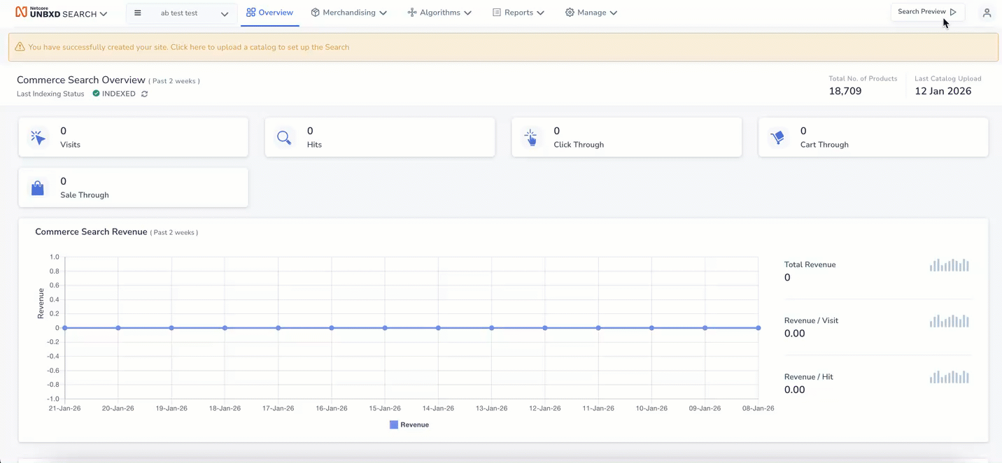 - On the Unbxd console, click SEARCH PREVIEW in the top-right corner.