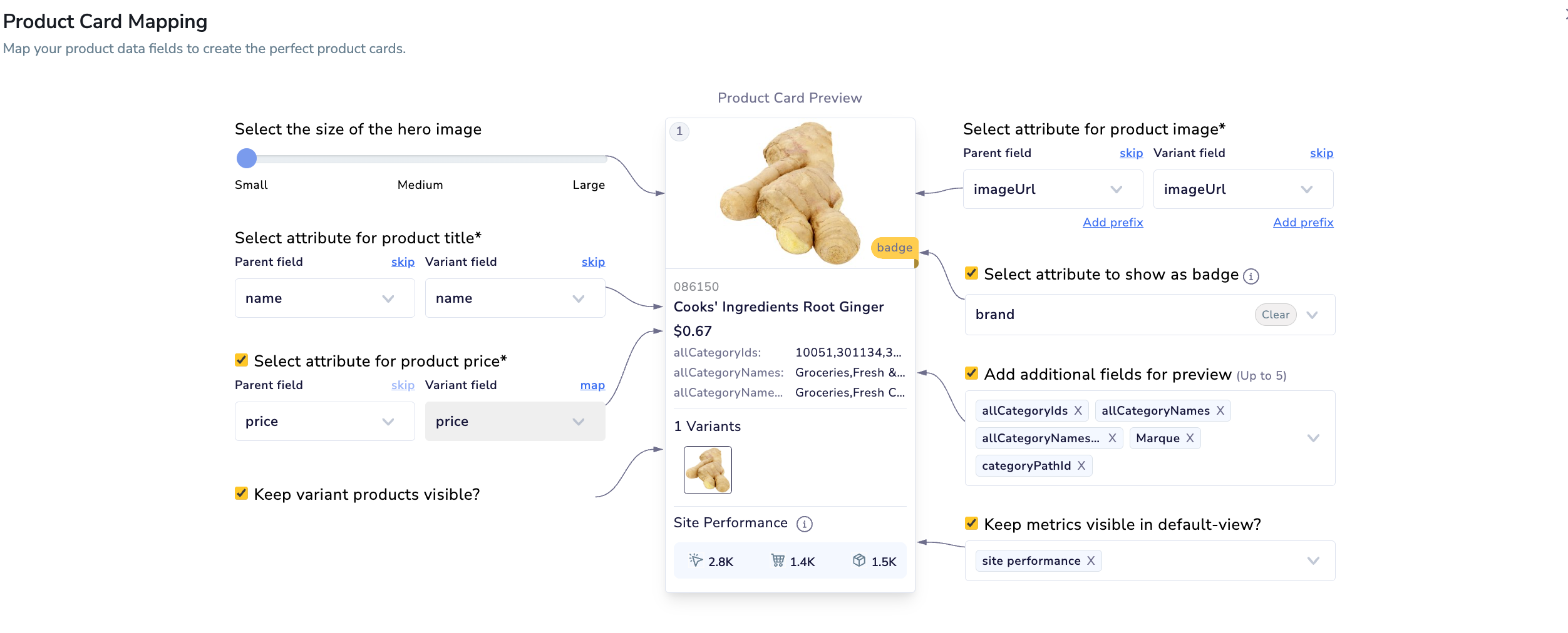 The Product Card Mapping feature allows you to configure how your product data appears on product cards across the platform. You can map specific attributes from your catalog feed to build, preview, and enhance a compelling product card experience, including visual product badges.