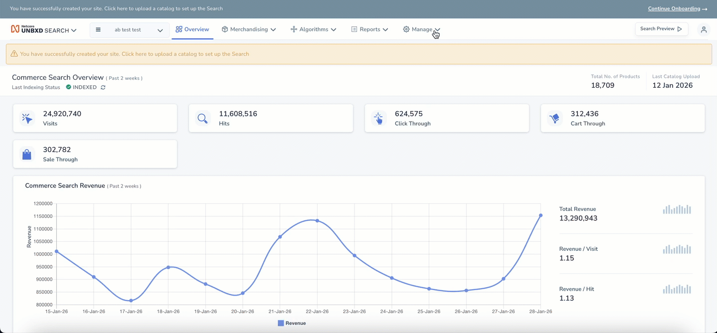 Log in to your Netcore Unbxd panel, then navigate to Manage > Site Cloning. You will land on the Site Cloning Overview page.